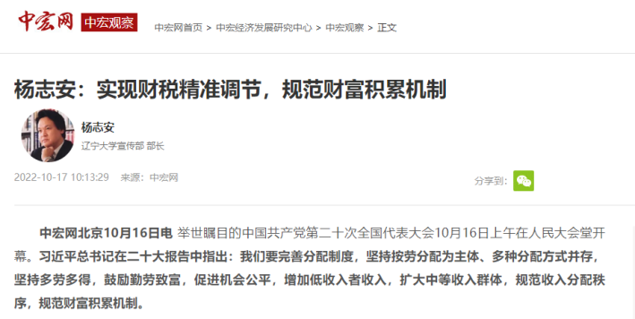 中宏观察家、辽宁大学宣传部部长杨志安教授就党的二十大精神以及规范财富积累机制等重要论述接受中宏观察视频访谈。