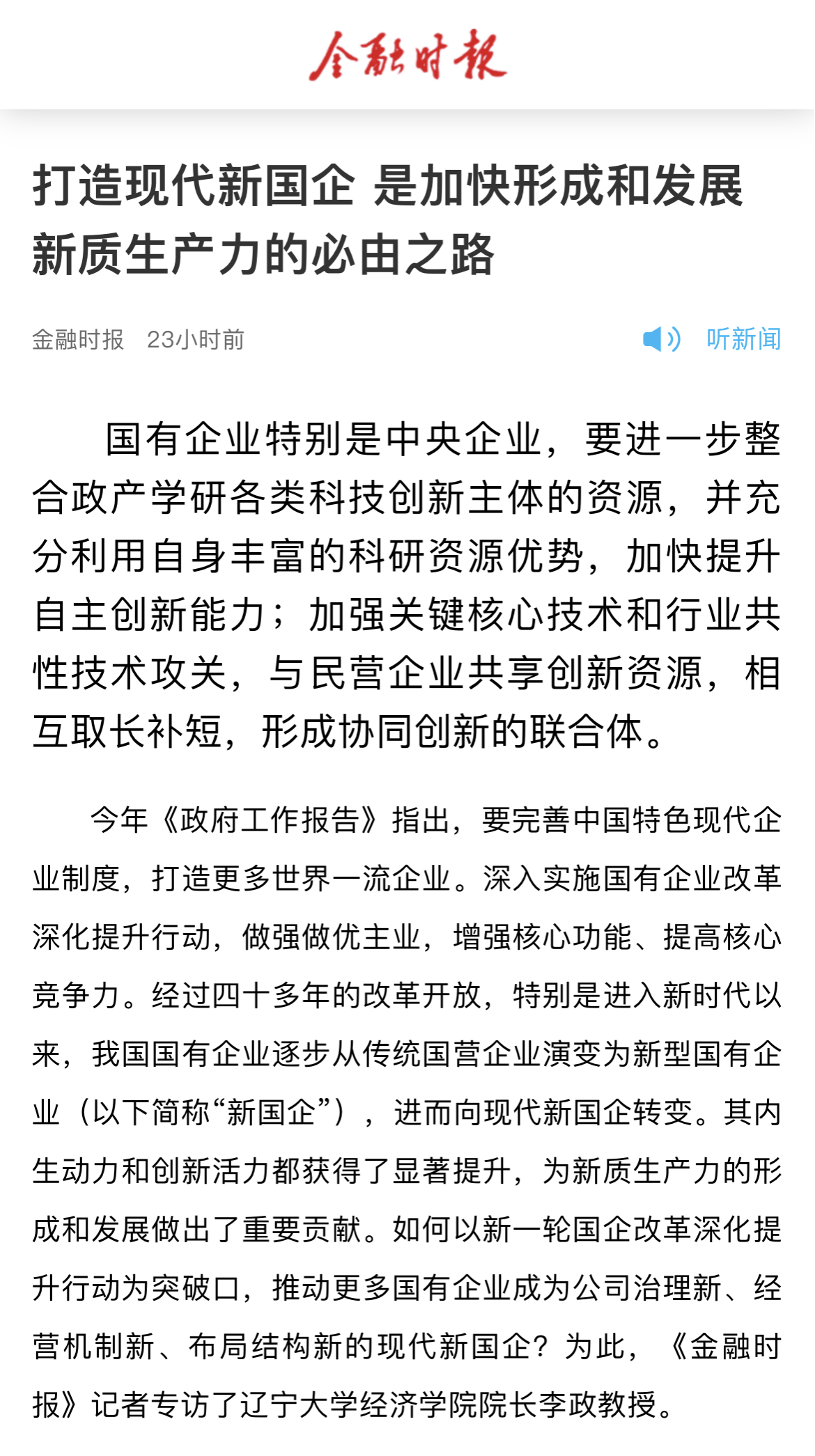 今年《政府工作报告》指出,要完善中国特色现代企业制度,打造更多世界一流企业。深入实施国有企业改革深化提升行动,做强做优主业,增强核心功能、提高核心竞争力。经过四十多年的改革开放,特别是进入新时代以来,我国国有企业逐步从传统国营企业演变为新型国有企业(以下简称“新国企”),进而向现代新国企转变。其内生动力和创新活力都获得了显著提升,为新质生产力的形成和发展做出了重要贡献。如何以新一轮国企改革深化提升行动为突破口,推动更多国有企业成为公司治理新、经营机制新、布局结构新的现代新国企?为此,《金融时报》记者专访了bwin必赢院长李政教授。