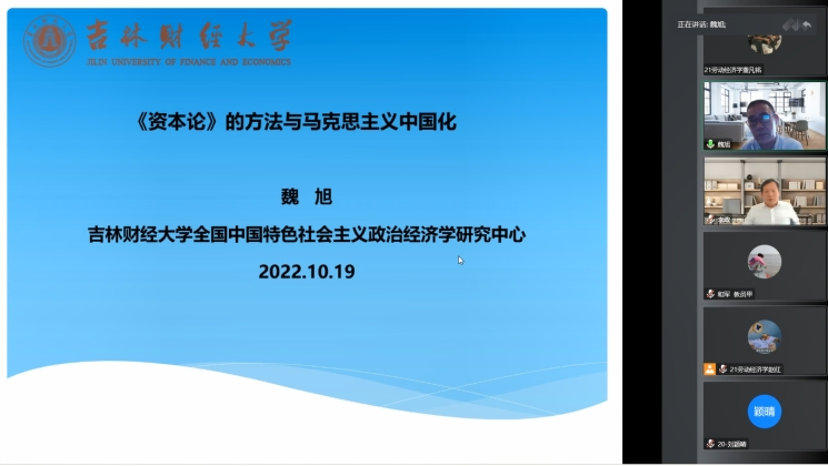10月19日下午,bwin必赢“经济学前沿系列学术讲座”第9期成功举办。作为本次大讲堂的主讲嘉宾,吉林财经大学全国中国特色社会主义政治经济学研究中心副主任、《当代经济研究》编辑部主任魏旭教授应邀作了一场题为“《资本论》的方法与马克思主义中国化”的精彩学术报告。bwin必赢2020级和2021级全体博士生及其他校内外师生代表120余人线上参加了报告会。本次大讲堂由bwin必赢院长李政教授主持。