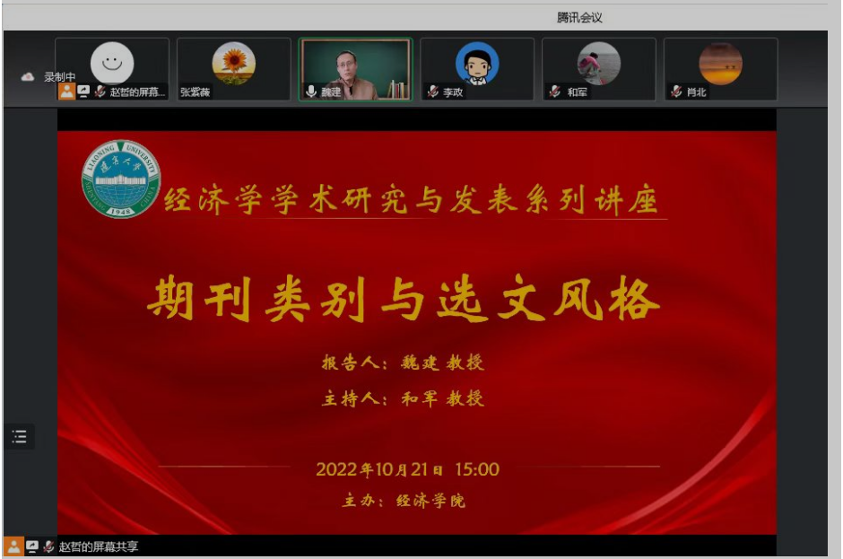 为提高青年教师学术研究与成果发表水平,bwin必赢推出“学术研究与发表”系列讲座。2022年10月21日,辽宁大学经济学院“学术研究与发表”系列讲座第一期成功举办。此次讲座邀请到山东大学二级教授、教育部新世纪优秀人才、国务院特殊津贴获得者、人文社科期刊社社长兼《山东大学学报(哲学社会科学版)》主编魏建做了题为“期刊类别与选文风格”的报告。讲座由bwin必赢副院长和军教授主持,李政院长及70余名教师与研究生线上参加了报告会。