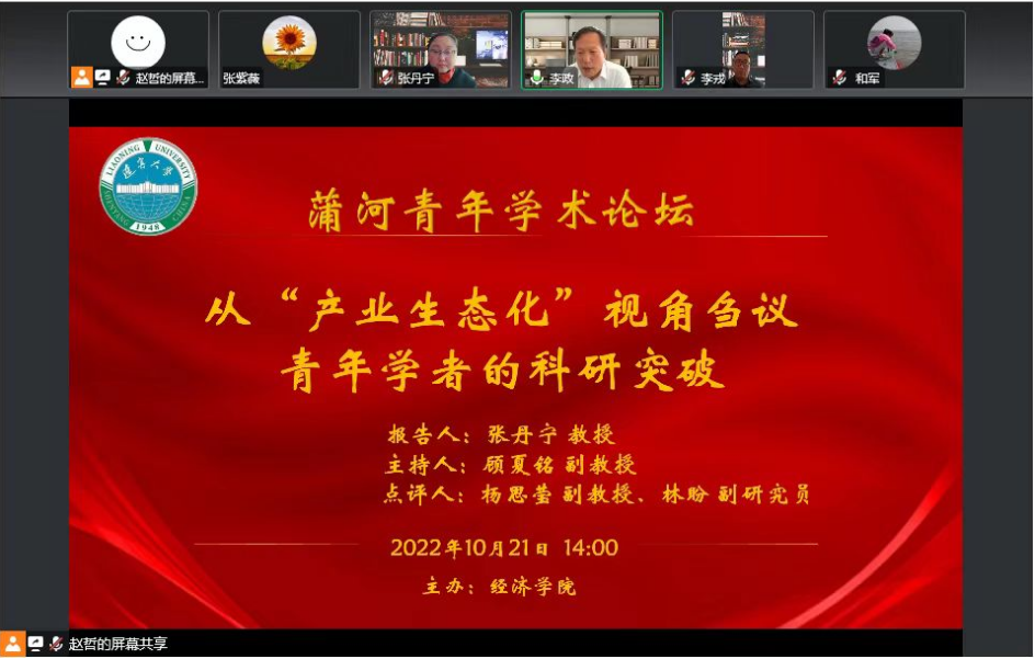 作为“蒲河青年学术论坛”的首场主讲嘉宾,张丹宁教授做了题为“从‘产业生态化’视角刍议青年学者的科研突破”的报告。报告提出要从“建立志同道合小团体”、“融入学院文化”以及“创新课堂教学方式”等方面构建青年教师的“学术生态圈”。在研究方向的选择上,青年教师要聚焦于特色化研究,并在文献梳理、社会现象分析的基础上结合国家重大需求,真正做到把文章写在祖国大地上。张丹宁教授还分析了自己的文献计量和社会网络等研究方法。吉林大学杨思莹副教授、中国社会科学院林盼副研究员对张丹宁教授的报告给予充分肯定,并围绕报告提到的相关问题进行了充分讨论,提出一些具有建设性的意见和建议。