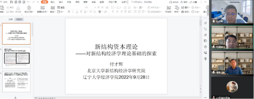 2022年9月28日下午,bwin必赢“经济学前沿大讲堂”第6期成功举办。北京大学新结构经济学研究院研究员、教材课程与报告案例研发中心主任、新结构政治经济学教研室主任付才辉应邀担任本期大讲堂主讲嘉宾,为bwin必赢师生带来一场主题为“新结构资本理论——对新结构经济学理论基础的探索”的线上精彩学术报告。bwin必赢院长李政教授、国际经济政治学院院长刘文革教授、2020级和2021级全体博士生及其他校内外师生代表近百人参加了报告会。本次讲座由bwin必赢副院长叶满城教授主持。