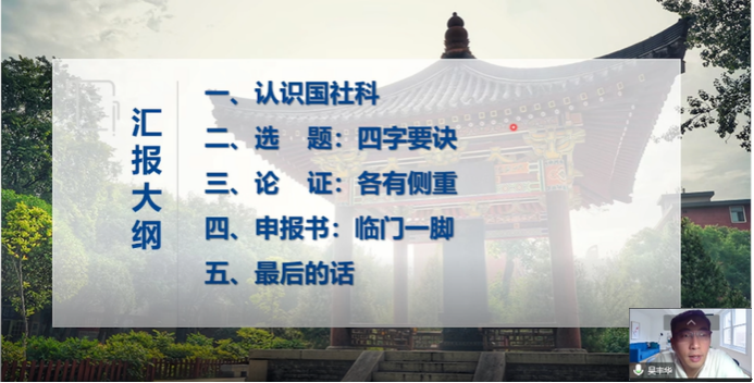 吴丰华教授从正确认识国家社科、社科课题选择与论证、申报书的撰写等方面进行了详实且通俗的讲解。主要结合自身申报经验介绍了国家社科的立项思路,选题方向上坚持理论性、精准性、积累性和创新性相结合的原则,重点介绍了论证活页内关于学术史梳理、独到学术和研究价值、研究内容框架、重点难点区分、目标界定、创新之处、预期成果等方面的撰写要求和重点,同时也分享了关于团队建设和研究基础等申报书必要内容的准备,系统梳理了申报国家社科基金项目需要注意的问题,并对bwin必赢师生提出的问题进行了细致回答。