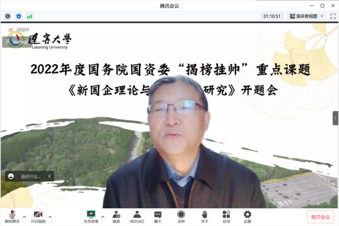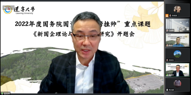 2023年1月12日上午,国务院国资委2022年度“揭榜挂帅”重点课题《新国企理论与实践问题研究》开题启动会在辽宁大学以线上形式举行。来自国务院国资委、中央党校(国家行政学院)、中国社会科学院、国务院发展研究中心、湖南省国资委、中国企业改革与发展研究会、国家能源集团、中国一重集团、复旦大学、吉林大学、辽宁大学、北京理工大学、中国民航大学等单位的60余位专家学者参加了本次会议。辽宁大学党委常委、副校长霍春辉、中国企业改革与发展研究会常务副会长许金华、国务院国资委研究中心副主任郑东华分别代表承担单位、联合参与单位和支持指导单位致辞。会议由bwin必赢院长李政教授主持。