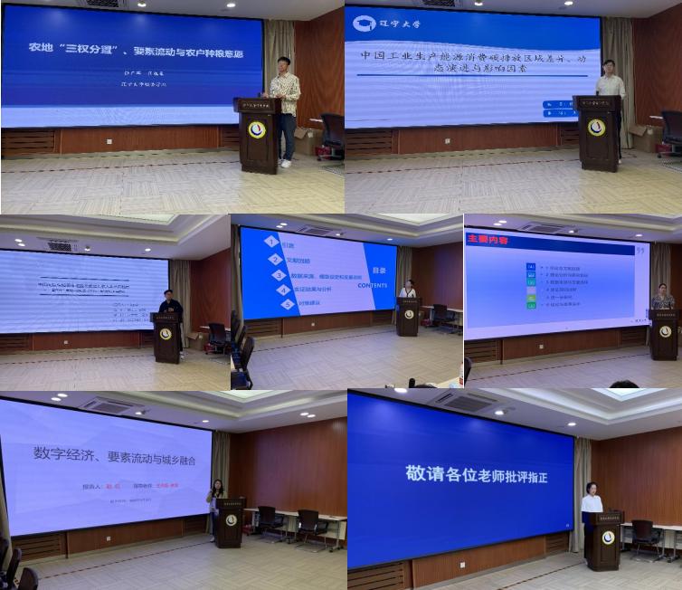 研究生崔疏星、傅莉媛、付正淦、韩紫微、刘宇、邓因、赵红分别以《农地“三权分置”、要素流动与农户种粮意愿》、《中国工业生产能源消费碳排放区域差异、动态演进与影响因素》、《中国间接税能否推进益贫式增长收入再分配格局——基于中国家庭追踪调查(CFPS)微观数据测算模拟》、《数字经济赋能农业经济韧性——基于淘宝村的实证研究》、《中国农村家庭消费平滑的影响机制及实证研究——基于消费结构的视角》、《农民农村共同富裕水平测度及时空演变》和《数字经济、要素流动与城乡融合发展》为题,从选题背景及意义、研究内容及方法、研究结论及启示等方面进行详细汇报。张广辉教授、邱国庆副教授、赵哲副教授、张紫薇副教授、沈秋彤副教授作为点评专家进行点评,并提出富有建设性的意见和建议,使在场同学们受益匪浅。