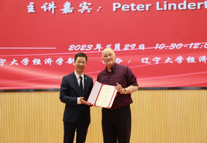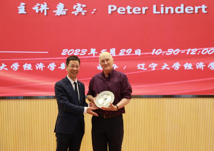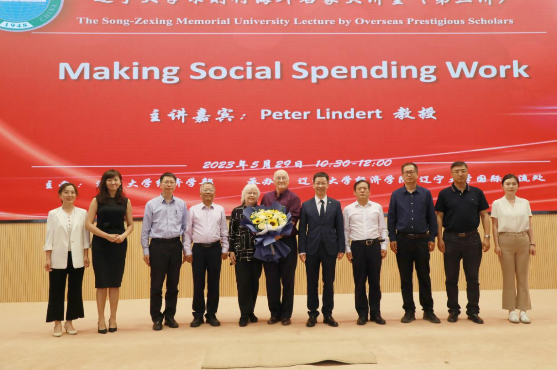 2023年5月29日上午,辽宁大学宋则行海外名家大讲堂(第三讲)在蒲河校区校部办公楼学术报告厅举行。美国著名经济历史学家、加州大学戴维斯分校杰出经济学教授、英国科斯切尔特埃塞克斯大学客座教授、美国国家经济研究局研究员彼得•林德特(Peter Lindert)教授应邀作了题为《让社会支出发挥作用(Making Social Spending Work)》的学术报告。第十四届全国人大代表,辽宁省第十四届人大常委会委员,辽宁大学党委副书记、校长余淼杰教授出席报告会并致欢迎辞。会议由辽宁大学中国经济研究院副院长马湘君教授主持。