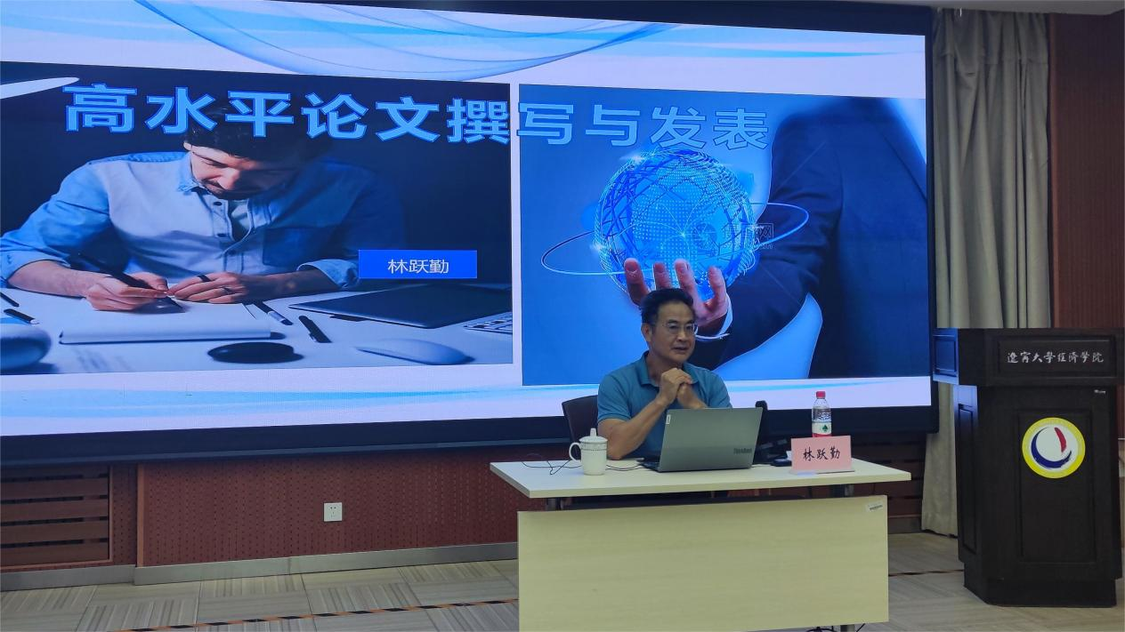 林跃勤教授从学术论文撰写与发表为何重要谈起,强调了撰写和刊发高水平学术论文的重要性,系统介绍了学术论文的基本特性、高水平论文的撰写要求以及应当具备的基本素质能力,围绕如何抓住选题、突出创新、论证充分、结构合理、引证规范、表述准确等方面进行了详细讲解并提出了宝贵建议。