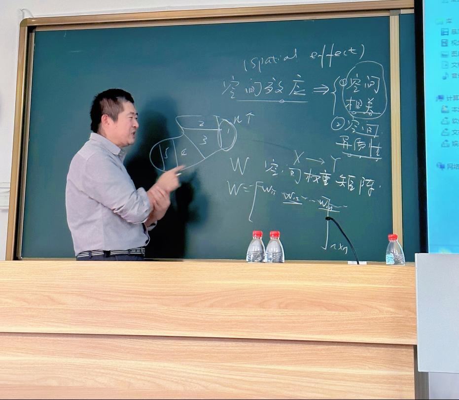 在讲座结束后,同学们积极与老师探讨本次学习内容,何彬副教授热情地与同学们展开了深入地交流与讨论。他建议同学们学习空间计量经济学前期要有充分的耐心,前期打好基础在后续操作过程中会取得事半功倍的效果。本次课程为大家做好科研提供了非常实用和有针对性的指导。