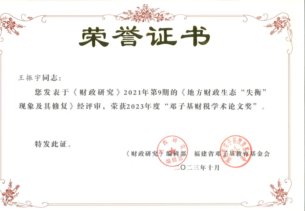 近日,中国式现代化进程中的财政改革学术研讨会暨2023年度《财政研究》“邓子基财税学术论文奖”颁奖典礼在山东济南顺利举行。王振宇教授与司亚伟讲师、博士研究生路遥发表于《财政研究》2021年第9期的《地方财政生态“失衡”现象及其修复》荣获2023年度《财政研究》“邓子基财税学术论文奖”。《财政研究》邓子基财税学术论文奖由财政部主管、中国财政学会主办的《财政研究》杂志与福建省邓子基教育基金会于2011年共同设立。在本届评奖过程中,《财政研究》编辑部遵照双方共同制定的评奖章程评选出六篇获奖作品。