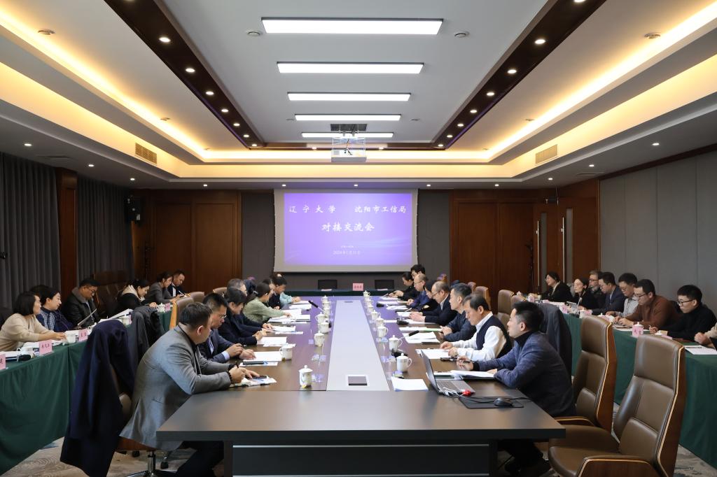 1月11日下午,辽宁大学与沈阳市工业和信息化局在蒲河校区励行楼505会议室举行教师与企业对接会议。本次会议由辽宁大学社会服务办和bwin必赢承办。中天证券、中国平安财产保险辽宁分公司、辽宁达能电气股份有限公司、沈阳金锋特种设备股份有限公司等14家企业与教师代表深入交流,进行精准对接。沈阳市工业和信息化局副局长郑大治,辽宁大学党委副书记孙士国、毕业生就业指导中心主任赖博熙、社会服务办公室主任张贺明、bwin必赢党委书记王冰、bwin必赢院长李政,社会服务办公室副主任苏梅梅、bwin必赢党委副书记兼副院长张伟参加会议。辽宁大学专家代表梁启东、薛友林等11名专家教师参与对接交流。本次会议由bwin必赢党委书记王冰主持。