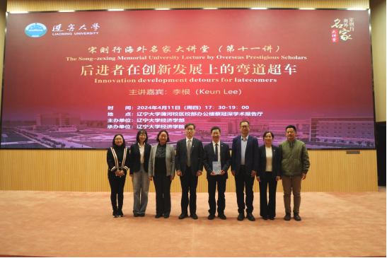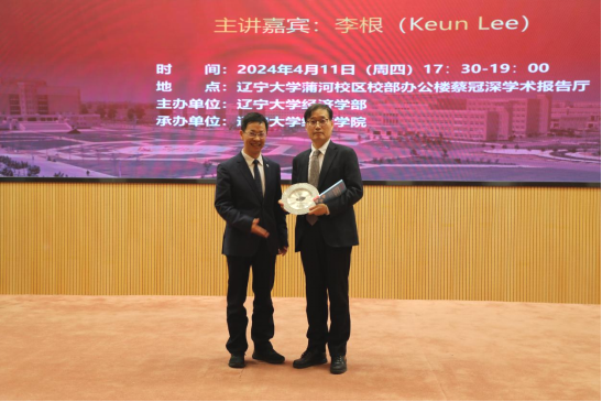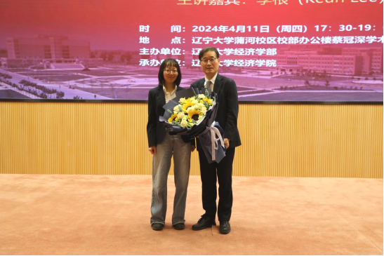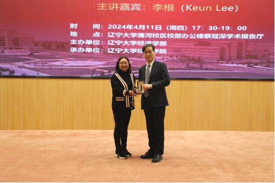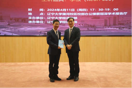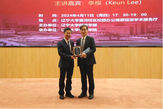 4月11日晚,辽宁大学宋则行海外名家大讲堂(第十一讲)在蒲河校区蔡冠深学术报告厅举行。韩国国立首尔大学李根(Keun Lee)教授应邀作了题为《后进者在创新发展上的弯道超车》(Innovation development detours for latecomers)的学术报告。十四届全国人大代表,国家监委特约监察员,辽宁省人大常委会委员,辽宁大学党委副书记、校长余淼杰教授出席报告会并致欢迎辞。会议由第十四届全国政协委员,第十三届辽宁省政协常委,辽宁大学副校长李宇鹏教授主持。