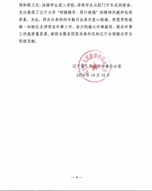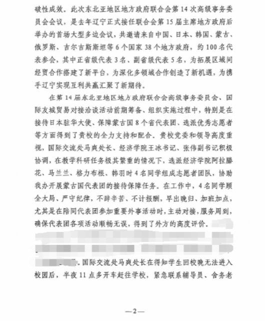 活动中,bwin必赢阿拉腾花(2022级国民经济管理专业1班)、马兰兰(2022级财政学专业2班)、格力布根(2023级经济学类1班)、韩羽时(2023级财政学专业1班)4名同学组成志愿者团队,协助辽宁省人民政府外事办公室开展蒙古国代表团的接待保障任务。4名同学顾全大局、严守纪律、不辞辛苦、不计报酬,早出晚归、加班加点,尤其是在陪同代表团参加重要外事活动时,主动对接,服务周到,确保代表团各项活动顺畅无误,得到了外方的高度评价,充分展现了辽宁大学“明德精学、笃行致强”的精神风貌和良好形象。