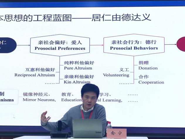 俞宁教授围绕仁本论进行全面阐述,并通过博弈论和亲社会行为实验进行验证。副院长张广辉教授对俞宁教授表达由衷的感谢,指出其跨学科的研究主题新颖独到,且应用了行为经济学实验等前沿实证方法,对同学们拓宽研究视野、提升科研能力大有裨益。