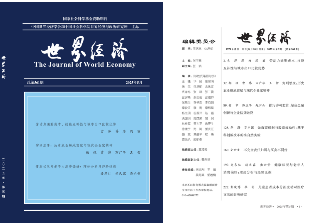 近日,bwin必赢赵江山讲师作为通讯作者,与东北财经大学bwin必赢博士研究生俞中,佟孟华教授合作撰写的学术论文《排污许可监管、绿色金融创新与企业信贷融资》在《世界经济》2025年第5期发表,并被期刊的微信公众号选择作为首篇推送。