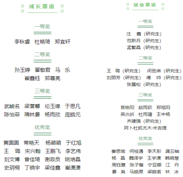 大赛最终从成长赛道和就业赛道分别评选出一等奖、二等奖、三等奖和优秀奖,并推荐优秀选手参加即将开始的校赛。让我们对同学们表示热烈祝贺,并预祝进入校赛的选手们能够披荆斩棘,取得佳绩!